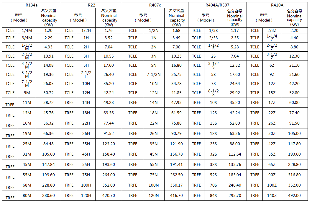 Note: The nominal cooling capacity is based on the evaporating temperature te=4.4°C, the condensing temperature tc=40°C, and the pre-valve refrigerant temperature t1=38°C.