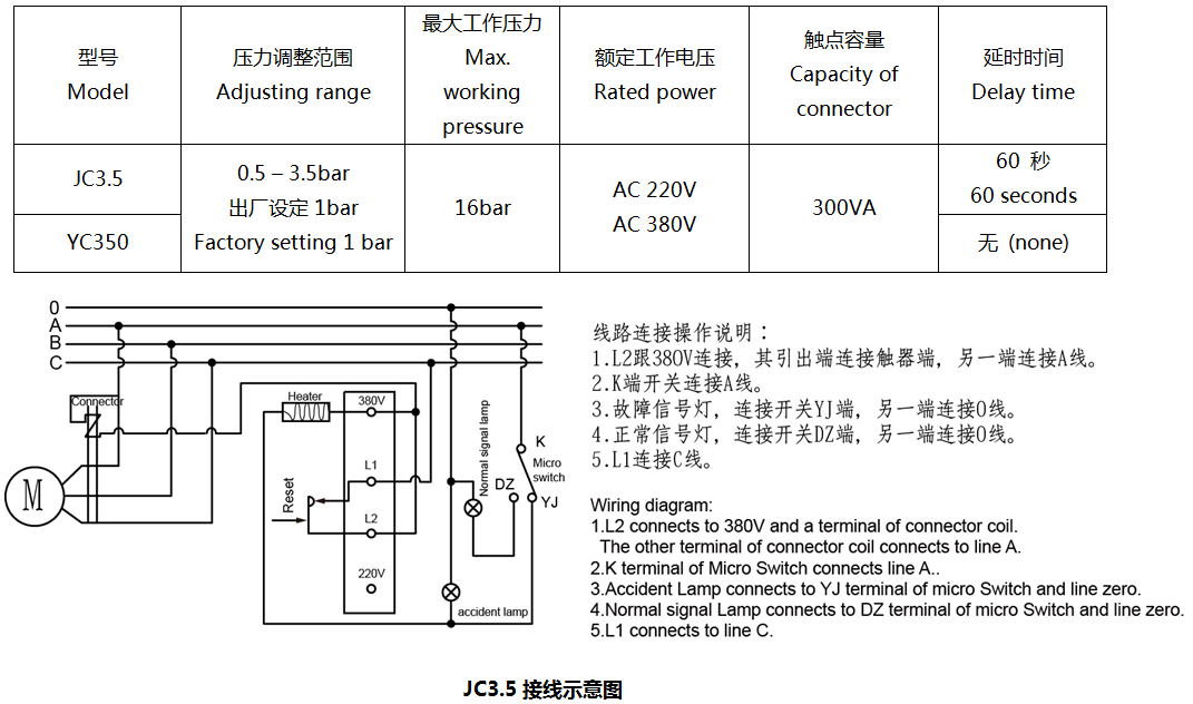 JC3.5/YC350壓差控制器是一種用于防止制冷壓縮機(jī)因潤(rùn)滑油的壓力不足而 損壞壓縮機(jī)的保護(hù)裝置。如果制冷壓縮機(jī)啟動(dòng)后,在60秒內(nèi)油壓建立不起來(lái), 則壓差控制器動(dòng)作自動(dòng)切斷電源,確保系統(tǒng)安全運(yùn)行。